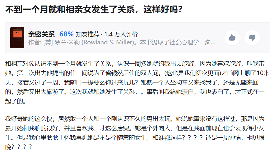 男生问答:不到一个月就和相亲女发生了关系,这样好吗?她是不是个随便的女生,和谁都这样?